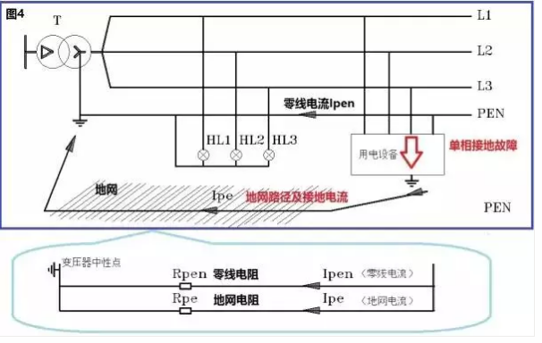 我們看圖4的下圖,我們發(fā)現(xiàn)當(dāng)L3相對用電設(shè)備的外殼短路時,保護(hù)性中性線中有電流流過,地網(wǎng)中也有電流流過。
