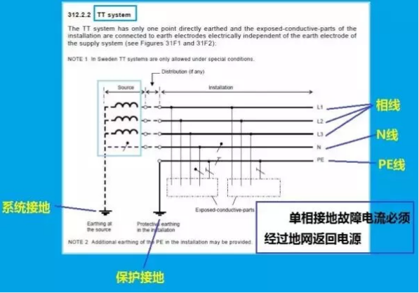 知曉這幾個概念后,我們來看看IEC給出的有關(guān)TN-C和TT系統(tǒng)的原圖。注意,這兩幅圖是不容置疑的,是有關(guān)接地系統(tǒng)的權(quán)威解釋。